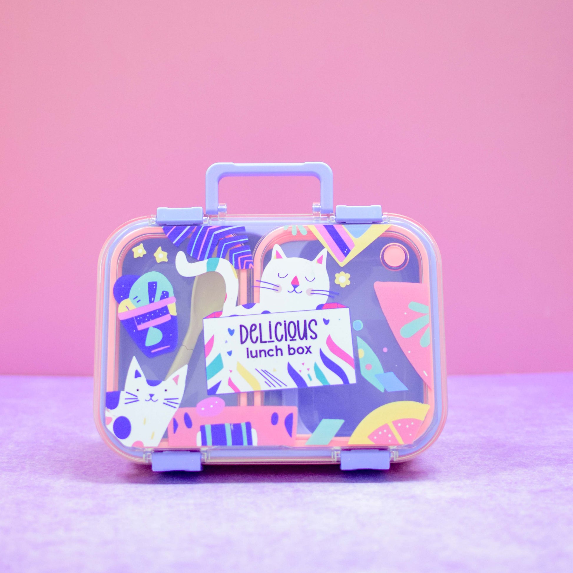 Lunch box de plástico con diseño de gatitos, práctico y ligero para llevar a todas partes. Cuenta con dos compartimentos que permiten organizar los alimentos sin que se mezclen, además de incluir cuchara. Su tapa con seguro garantiza un cierre hermético y evita derrames, ofreciendo un transporte confiable y cómodo.