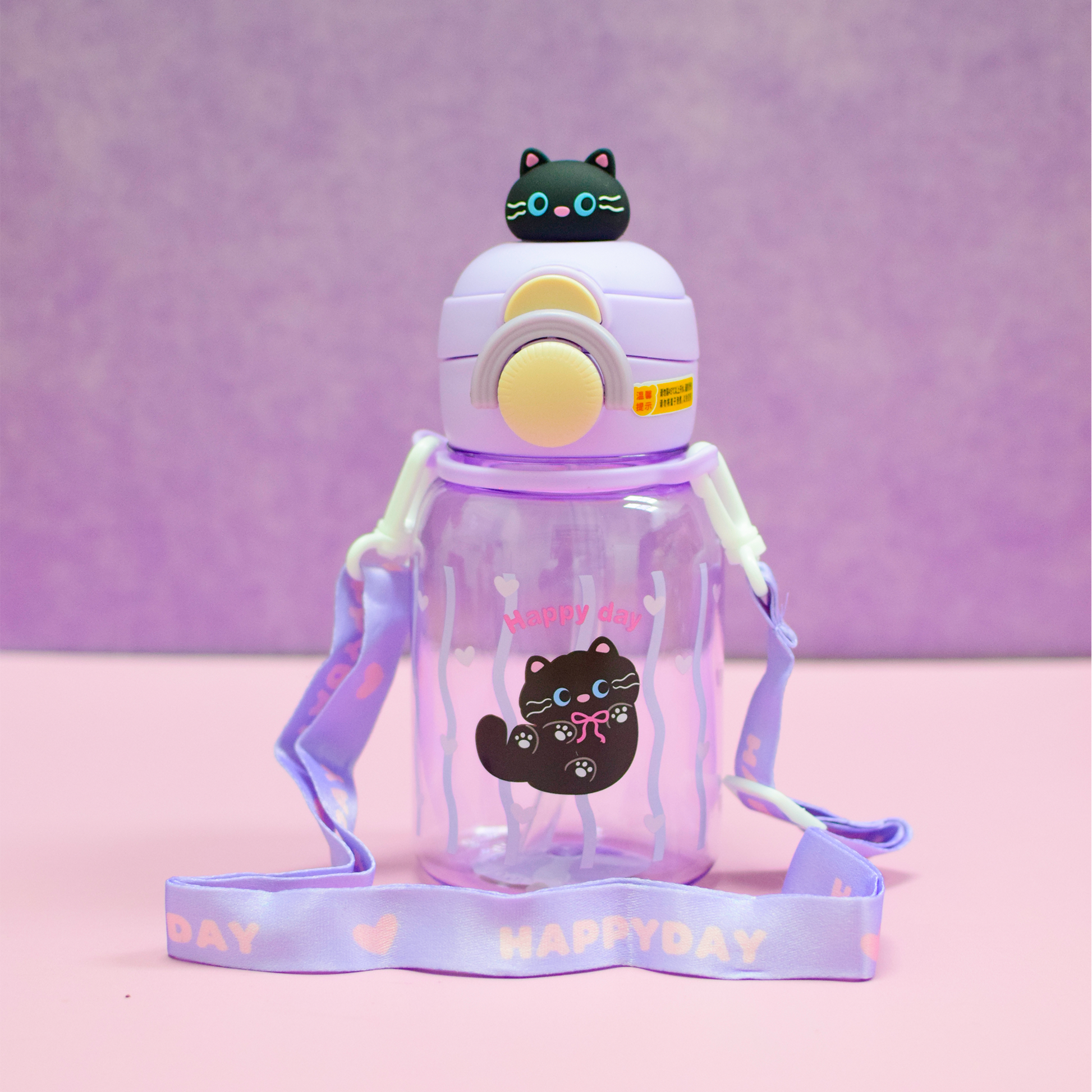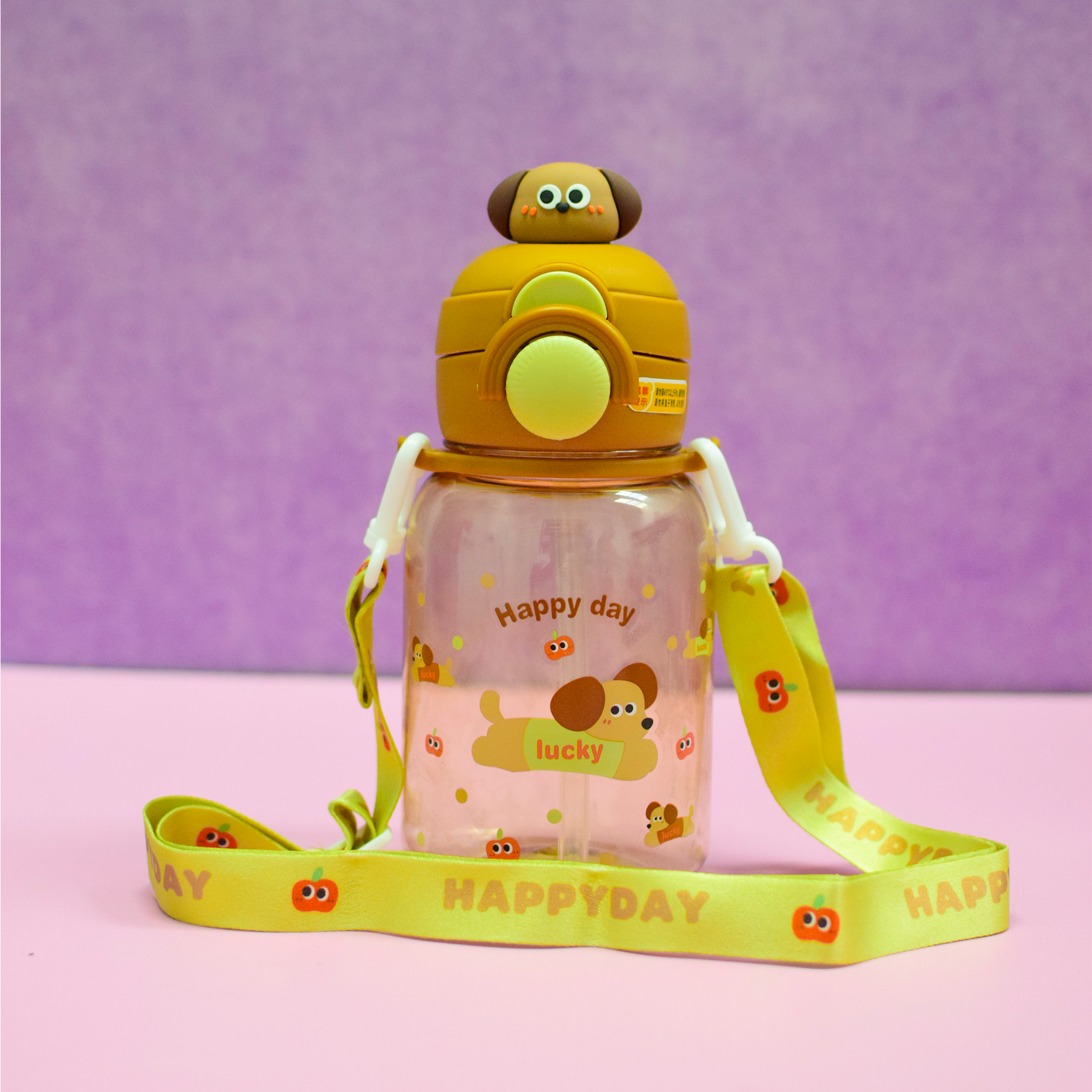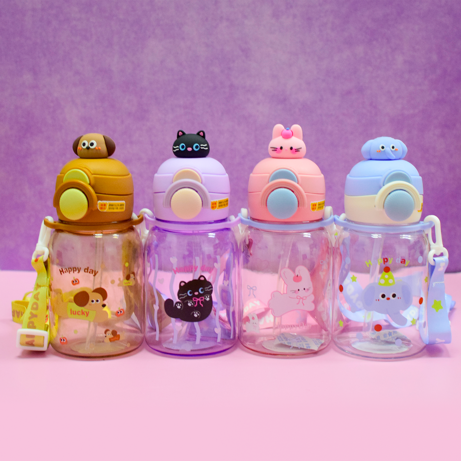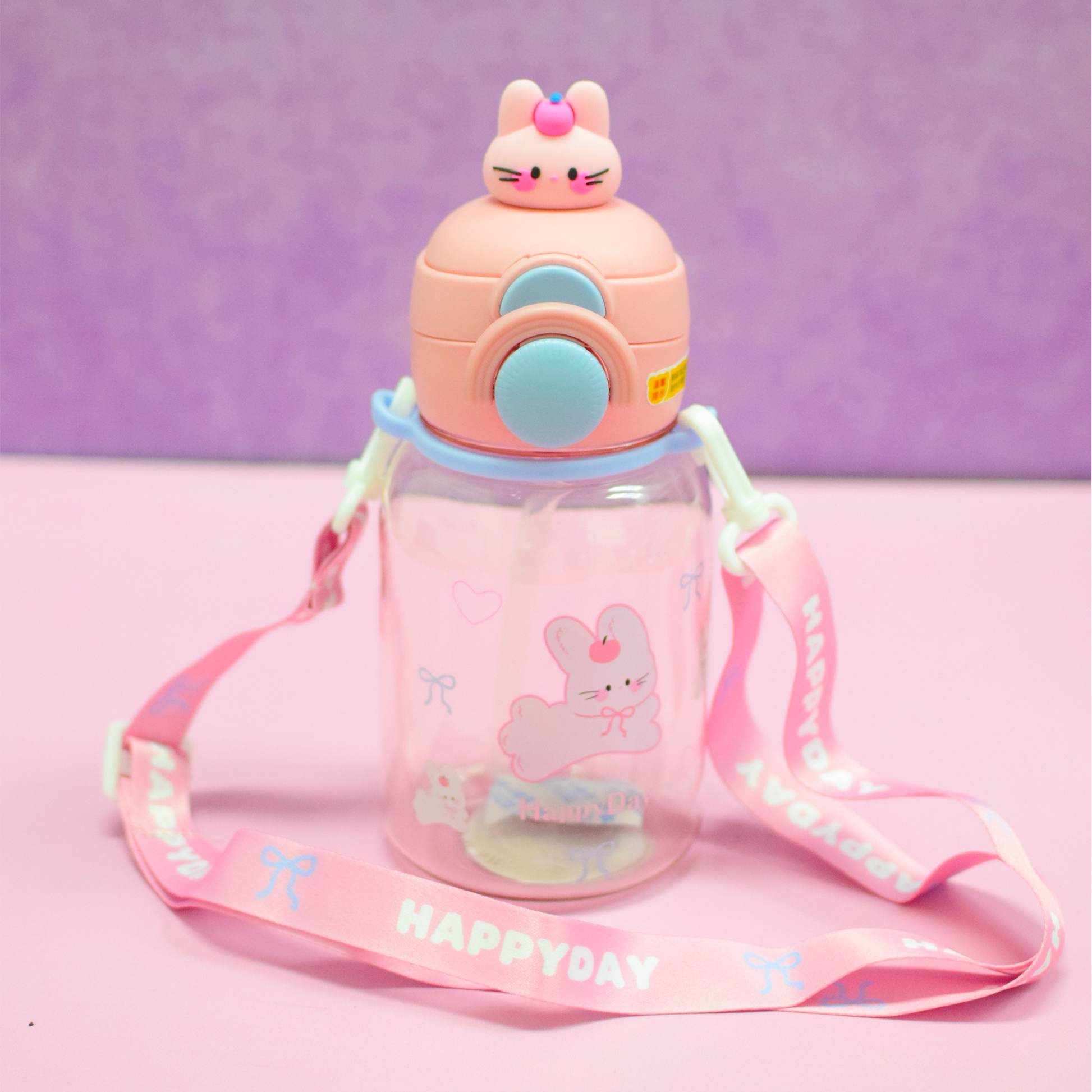Termo de plástico con capacidad 650 ml con correa, popote y tapa con bloqueo que evita derrames. Elaborado con material resistente y duradero, ideal para el uso diario. Su diseño con tiernos animales combina practicidad y estilo.