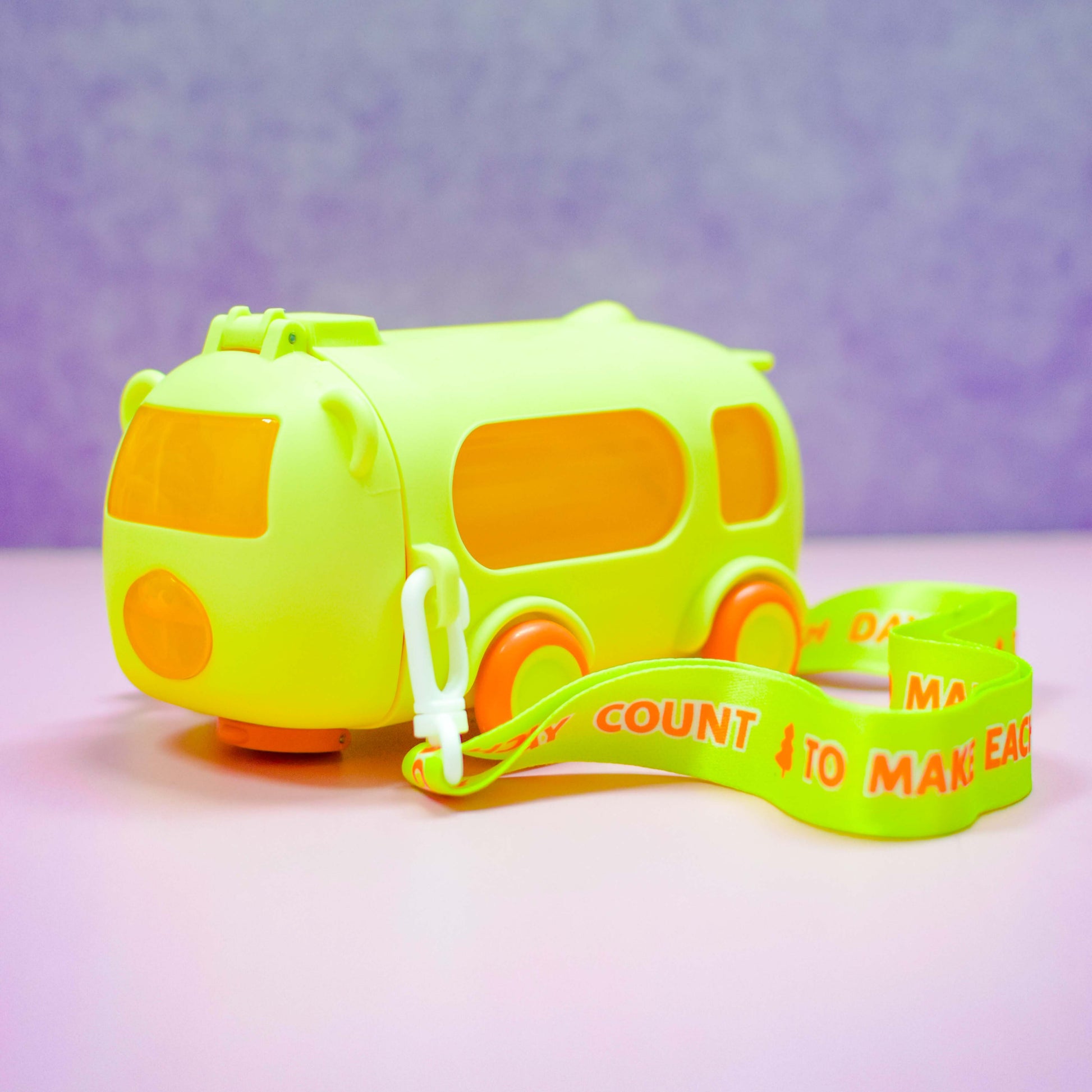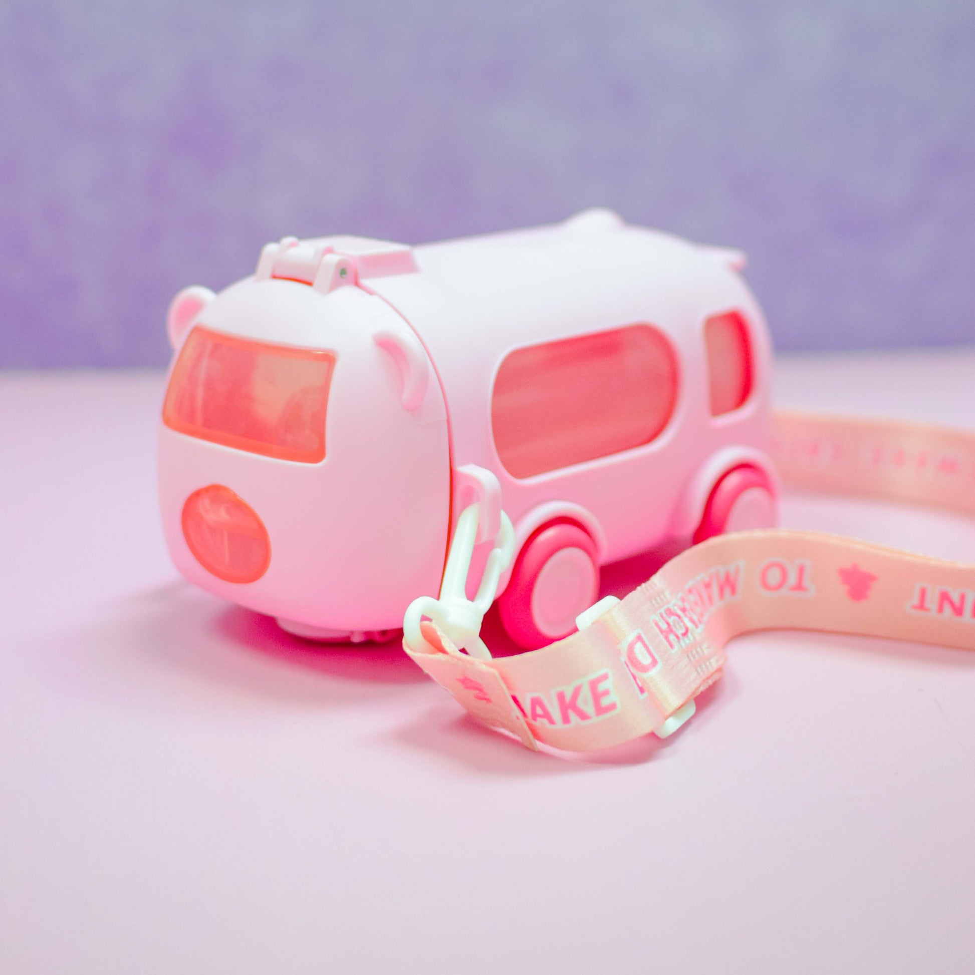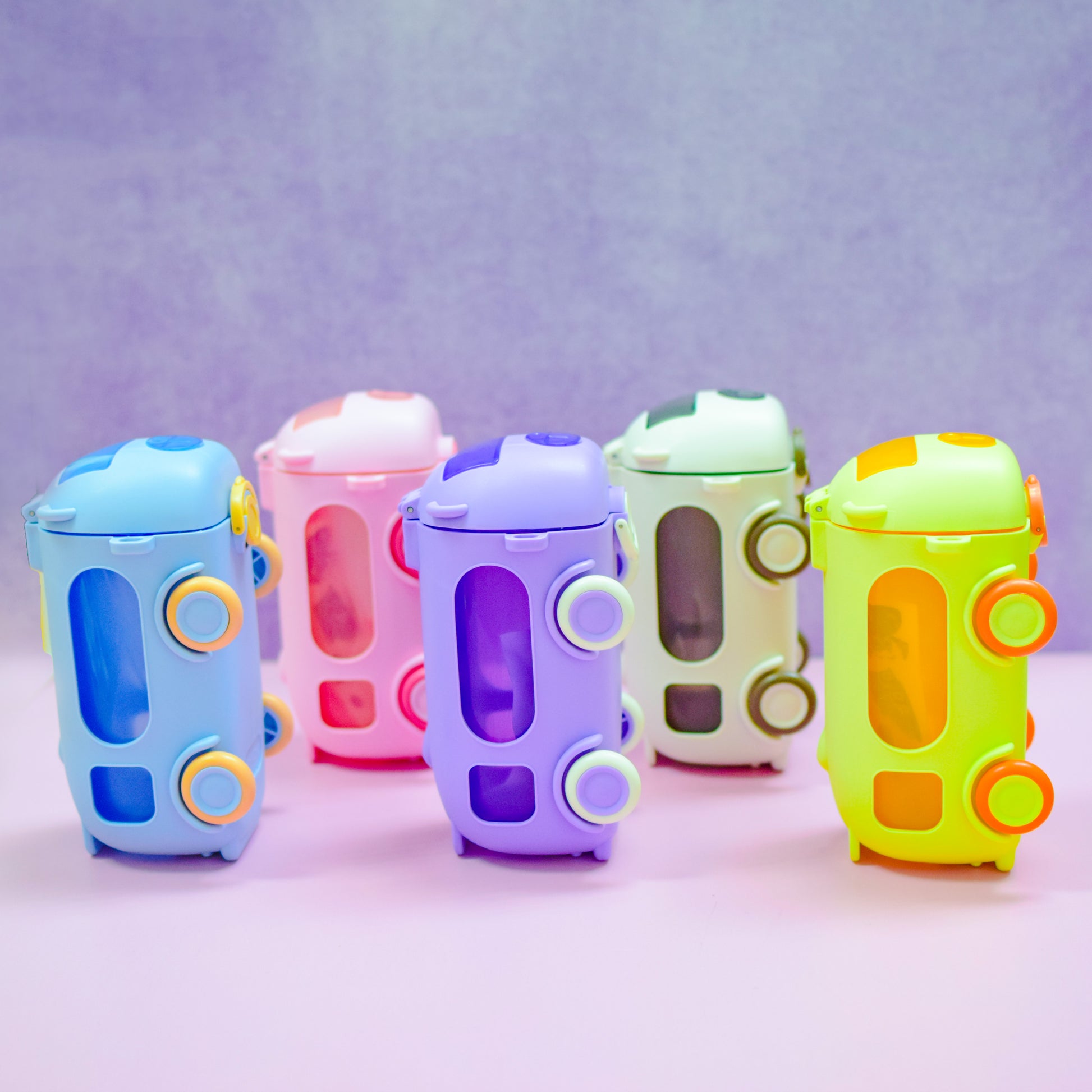 Termo de plástico con capacidad de 500 ml con correa, popote y seguro antiderrame. Elaborado con material resistente y duradero. Su diseño lindo de autobús con osito y llantas movibles lo hace práctico, original y divertido para el uso diario, ideal para la escuela.