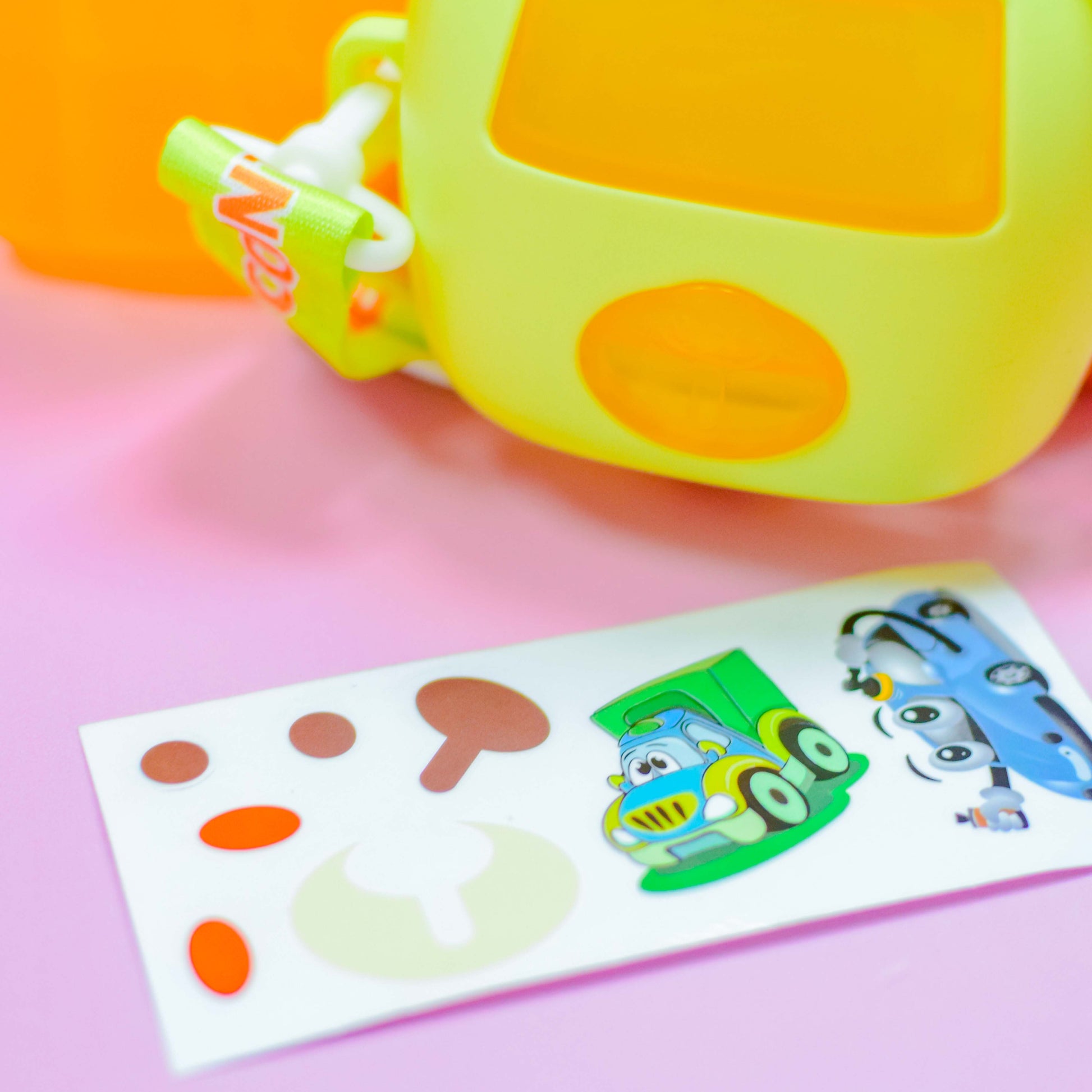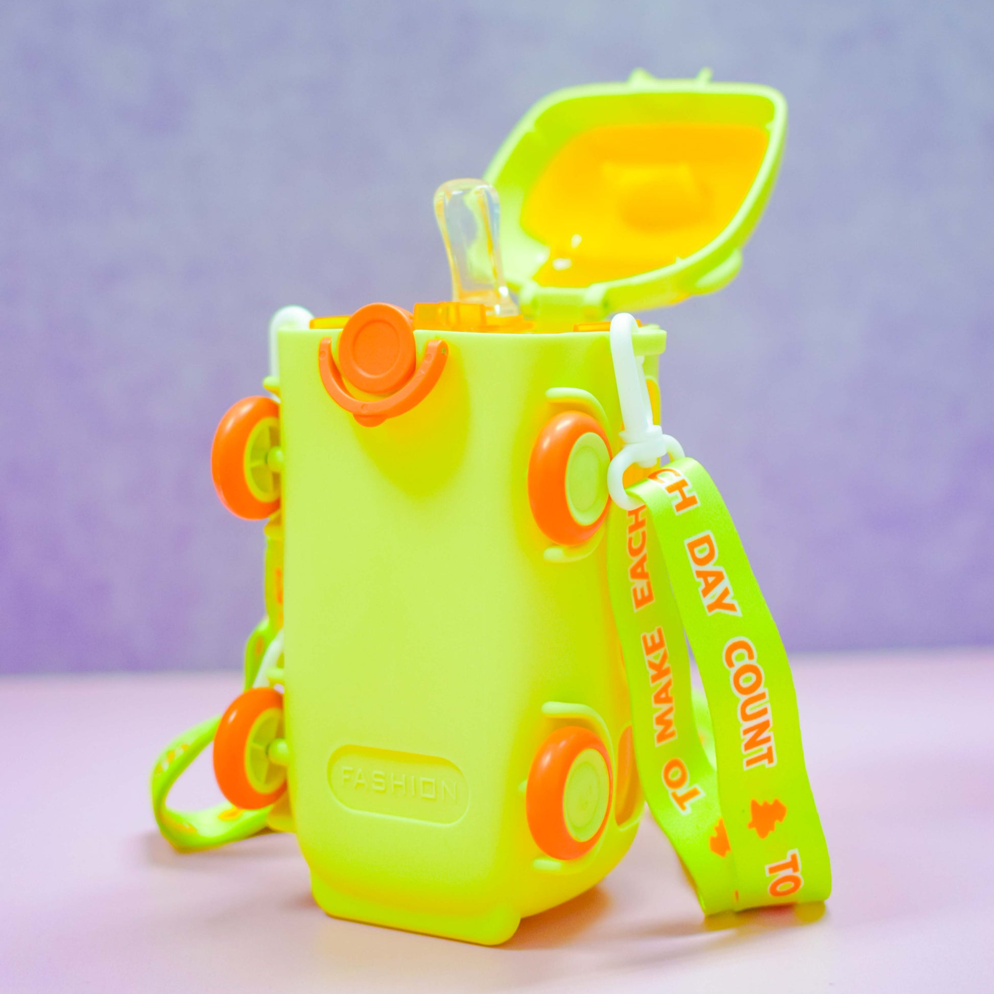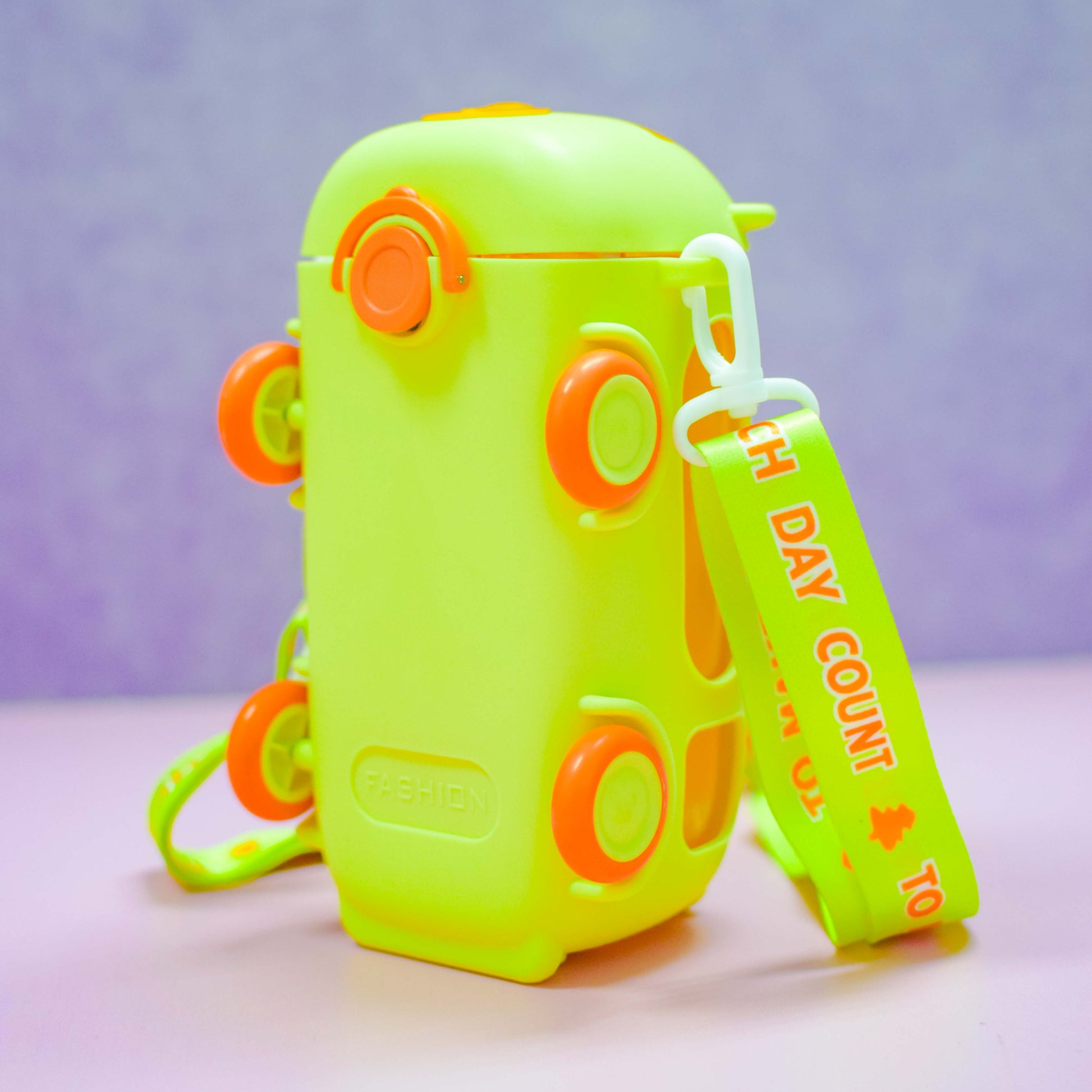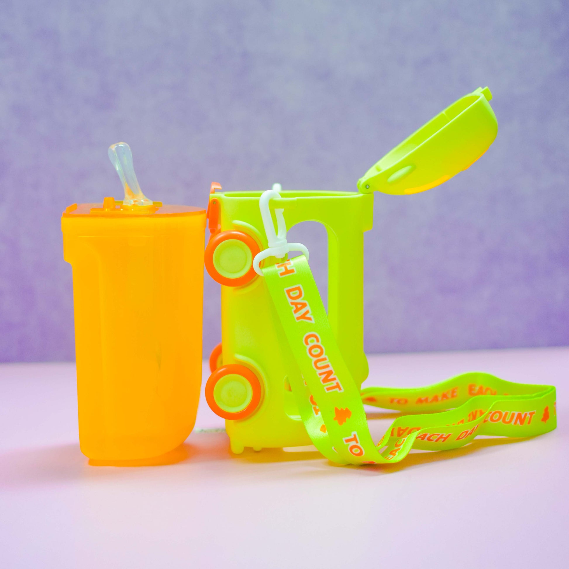 Termo de plástico con capacidad de 500 ml con correa, popote y seguro antiderrame. Elaborado con material resistente y duradero. Su diseño lindo de autobús con osito y llantas movibles lo hace práctico, original y divertido para el uso diario, ideal para la escuela.