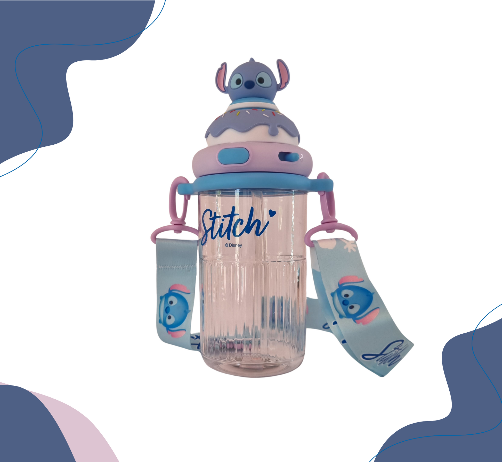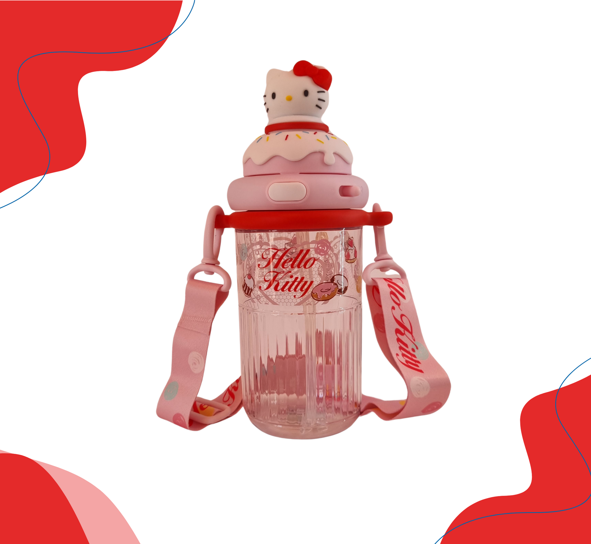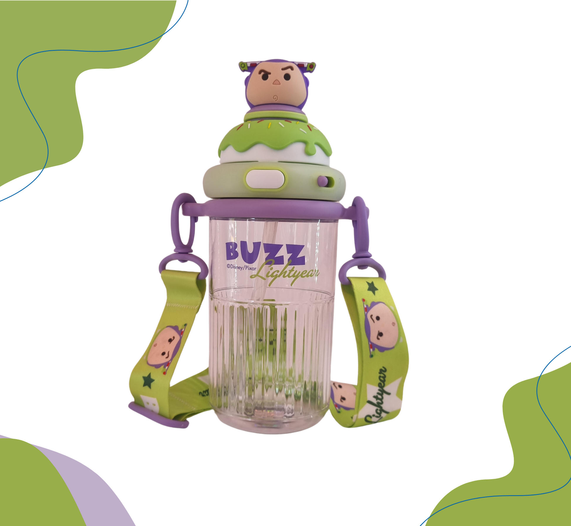 Termo con diseño de candy y personaje en 3D , con seguro antiderrame y doble boquilla, incluye strap, popote y agarradera. Disponible en 9 personajes.